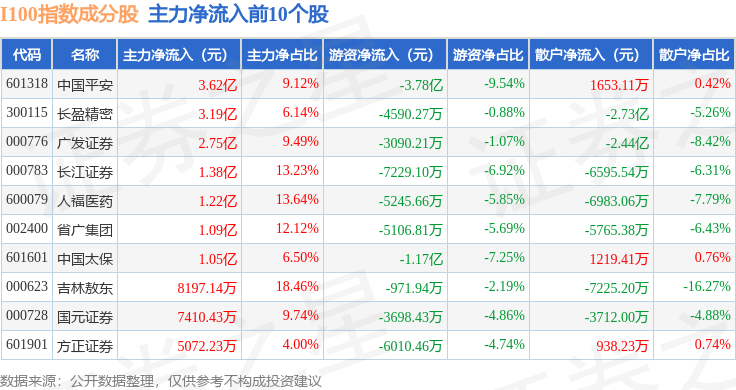 资金流向方面,I100(399415)指数成份股当日主力资金净流出合计20.08亿元,游资资金净流入合计7.44亿元,散户资金净流入合计12.65亿元。成份股资金流向详情见下表: