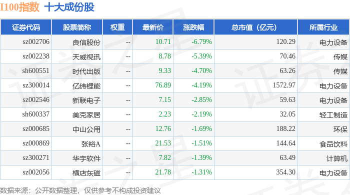I100(399415)指数十大成份股详情如下: