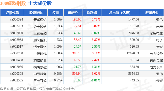 300绩效(399657)指数十大成份股详情如下: