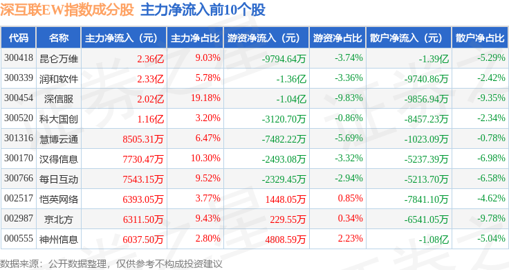 资金流向方面,深互联EW(399677)指数成份股当日主力资金净流出合计11.04亿元,游资资金净流入合计5.57亿元,散户资金净流入合计5.47亿元。成份股资金流向详情见下表: