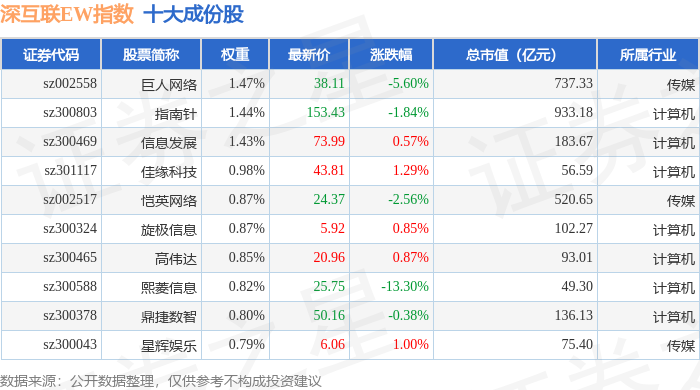 证券之星消息,10月27日,深互联EW(399677)指数报收于5740.46点,涨0.14%,成交857.34亿元,换手率3.76%。当日该指数成份股中,上涨的有100家,慧博云通以10.7%的涨幅领涨,下跌的有63家,熙菱信息以13.3%的跌幅领跌。