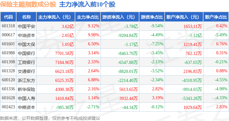 资金流向方面,保险主题(399809)指数成份股当日主力资金净流出合计6421.34万元,游资资金净流出合计8888.75万元,散户资金净流入合计1.53亿元。成份股资金流向详情见下表:
