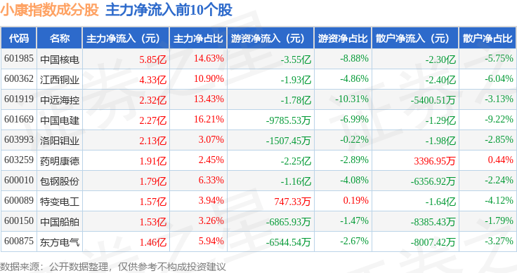 资金流向方面,小康指数(399901)成份股当日主力资金净流出合计2.77亿元,游资资金净流出合计3.44亿元,散户资金净流入合计6.21亿元。成份股资金流向详情见下表: