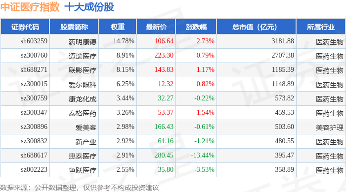 中证医疗(399989)指数十大成份股详情如下: