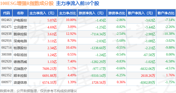 资金流向方面,100ESG增强R(470033)指数成份股当日主力资金净流出合计27.03亿元,游资资金净流入合计7.65亿元,散户资金净流入合计19.37亿元。成份股资金流向详情见下表: