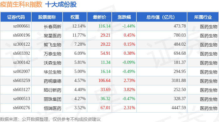 疫苗生科R(480015)指数十大成份股详情如下: