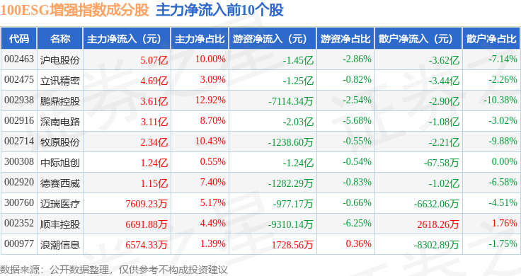 资金流向方面,100ESG增强(970033)指数成份股当日主力资金净流出合计27.03亿元,游资资金净流入合计7.65亿元,散户资金净流入合计19.37亿元。成份股资金流向详情见下表: