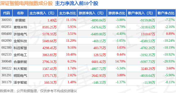 资金流向方面,深证智能电网(970054)指数成份股当日主力资金净流出合计17.94亿元,游资资金净流入合计3.2亿元,散户资金净流入合计14.74亿元。成份股资金流向详情见下表: