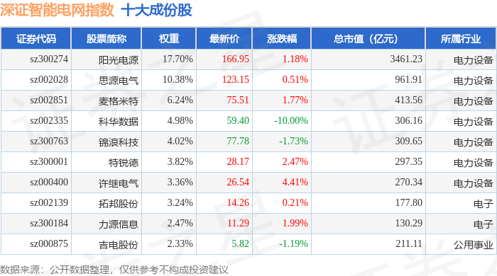 证券之星消息,10月27日,深证智能电网(970054)指数报收于3804.67点,涨0.83%,成交430.89亿元,换手率4.1%。当日该指数成份股中,上涨的有32家,新雷能以17.65%的涨幅领涨,下跌的有17家,科华数据以10.0%的跌幅领跌。