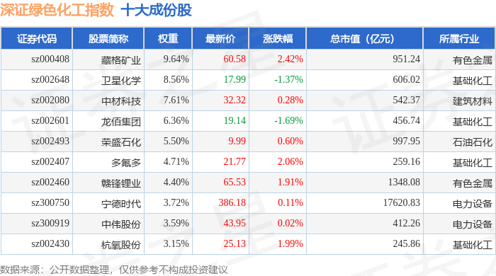 证券之星消息,10月27日,深证绿色化工(970076)指数报收于1583.82点,涨1.0%,成交506.94亿元,换手率2.3%。当日该指数成份股中,上涨的有30家,晶瑞电材以16.5%的涨幅领涨,下跌的有16家,星源材质以2.83%的跌幅领跌。