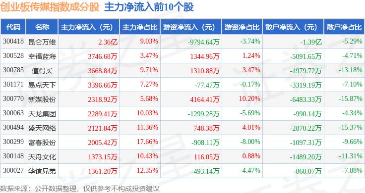 资金流向方面,创业板传媒(970084)指数成份股当日主力资金净流出合计1.83亿元,游资资金净流入合计1029.69万元,散户资金净流入合计1.73亿元。成份股资金流向详情见下表: