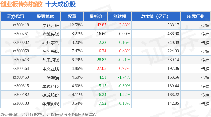 证券之星消息,10月27日,创业板传媒(970084)指数报收于1290.77点,涨0.39%,成交155.86亿元,换手率3.14%。当日该指数成份股中,上涨的有18家,昆仑万维以3.88%的涨幅领涨,下跌的有18家,荣信文化以4.84%的跌幅领跌。