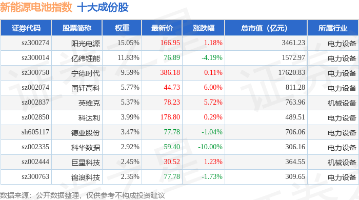 证券之星消息,10月27日,新能源电池(980027)指数报收于3364.88点,涨0.31%,成交803.36亿元,换手率3.09%。当日该指数成份股中,上涨的有31家,永福股份以12.52%的涨幅领涨,下跌的有18家,科华数据以10.0%的跌幅领跌。