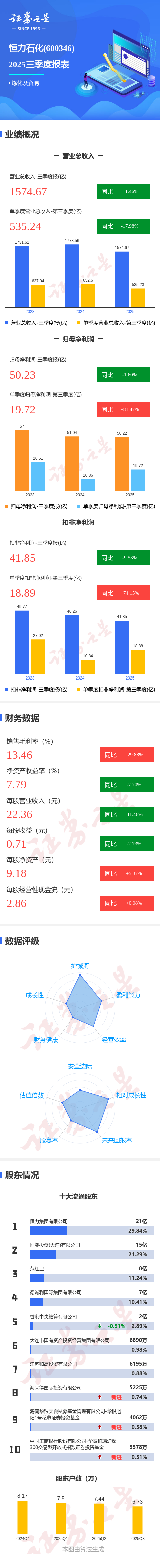 证券之星消息,恒力石化2025年三季报显示,公司主营收入1574.67亿元,同比下降11.46%;归母净利润50.23亿元,同比下降1.61%;扣非净利润41.85亿元,同比下降9.54%;其中2025年第三季度,公司单季度主营收入535.24亿元,同比下降17.99%;单季度归母净利润19.72亿元,同比上升81.47%;单季度扣非净利润18.89亿元,同比上升74.15%;负债率76.41%,投资收益-1772.22万元,财务费用35.18亿元,毛利率13.46%。