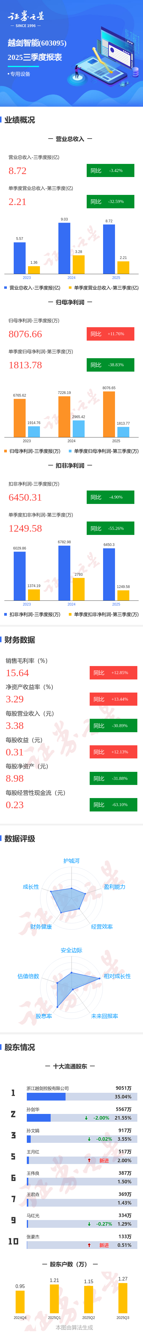 证券之星消息,越剑智能2025年三季报显示,公司主营收入8.72亿元,同比下降3.42%;归母净利润8076.66万元,同比上升11.77%;扣非净利润6450.31万元,同比下降4.9%;其中2025年第三季度,公司单季度主营收入2.21亿元,同比下降32.59%;单季度归母净利润1813.78万元,同比下降38.84%;单季度扣非净利润1249.58万元,同比下降55.26%;负债率22.19%,投资收益1417.37万元,财务费用-158.85万元,毛利率15.64%。