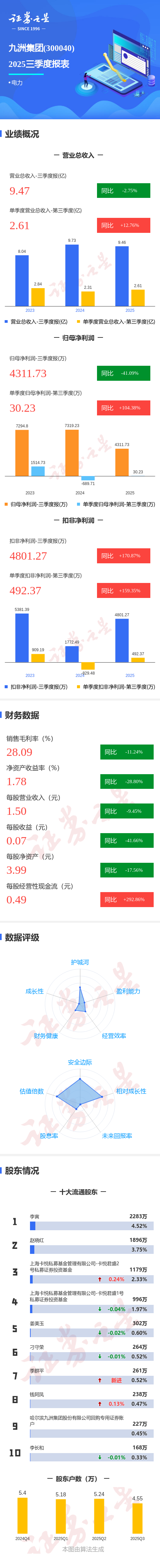 证券之星消息,九洲集团2025年三季报显示,公司主营收入9.47亿元,同比下降2.75%;归母净利润4311.73万元,同比下降41.09%;扣非净利润4801.27万元,同比上升170.88%;其中2025年第三季度,公司单季度主营收入2.61亿元,同比上升12.77%;单季度归母净利润30.23万元,同比上升104.38%;单季度扣非净利润492.37万元,同比上升159.36%;负债率64.75%,投资收益5311.37万元,财务费用1.05亿元,毛利率28.09%。