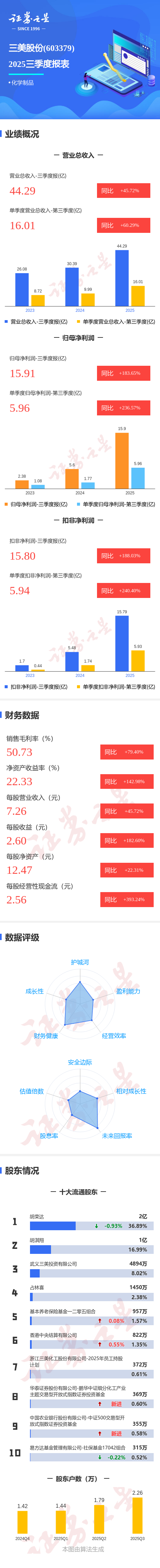 证券之星消息,三美股份2025年三季报显示,公司主营收入44.29亿元,同比上升45.72%;归母净利润15.91亿元,同比上升183.66%;扣非净利润15.8亿元,同比上升188.03%;其中2025年第三季度,公司单季度主营收入16.01亿元,同比上升60.29%;单季度归母净利润5.96亿元,同比上升236.57%;单季度扣非净利润5.94亿元,同比上升240.4%;负债率17.43%,投资收益2112.62万元,财务费用-3451.48万元,毛利率50.73%。
