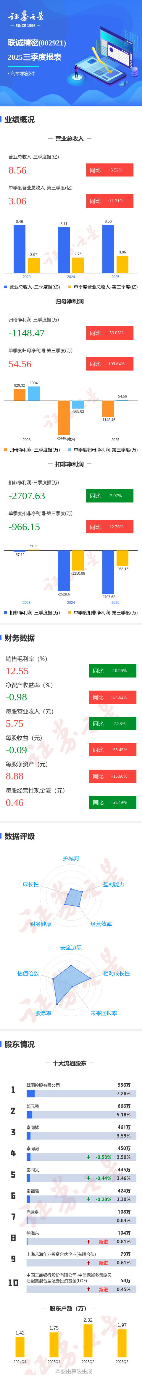 证券之星消息,联诚精密2025年三季报显示,公司主营收入8.56亿元,同比上升5.53%;归母净利润-1148.47万元,同比上升53.05%;扣非净利润-2707.63万元,同比下降7.08%;其中2025年第三季度,公司单季度主营收入3.06亿元,同比上升11.22%;单季度归母净利润54.56万元,同比上升109.65%;单季度扣非净利润-966.15万元,同比上升22.76%;负债率41.92%,投资收益651.54万元,财务费用2310.69万元,毛利率12.55%。
