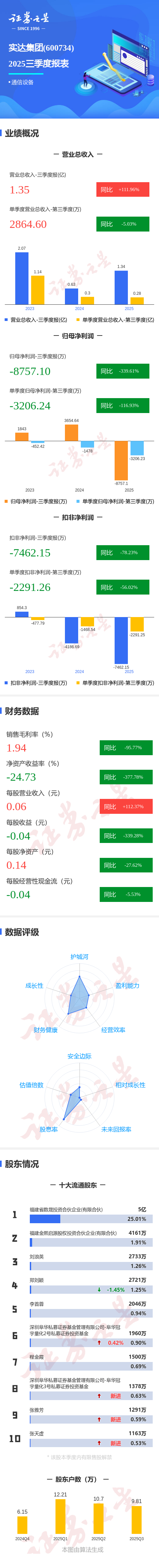 证券之星消息,实达集团2025年三季报显示,公司主营收入1.35亿元,同比上升111.97%;归母净利润-8757.1万元,同比下降339.62%;扣非净利润-7462.15万元,同比下降78.23%;其中2025年第三季度,公司单季度主营收入2864.6万元,同比下降5.04%;单季度归母净利润-3206.24万元,同比下降116.93%;单季度扣非净利润-2291.26万元,同比下降56.02%;负债率72.4%,投资收益-122.48万元,财务费用1153.88万元,毛利率1.94%。