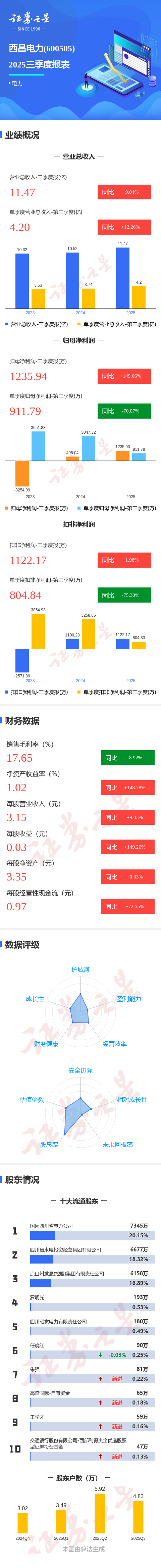 证券之星消息,西昌电力2025年三季报显示,公司主营收入11.47亿元,同比上升9.04%;归母净利润1235.94万元,同比上升149.66%;扣非净利润1122.17万元,同比上升1.99%;其中2025年第三季度,公司单季度主营收入4.2亿元,同比上升12.27%;单季度归母净利润911.79万元,同比下降70.08%;单季度扣非净利润804.84万元,同比下降75.3%;负债率67.09%,投资收益26.03万元,财务费用4846.49万元,毛利率17.65%。