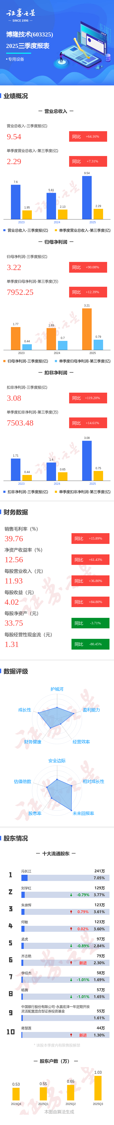 证券之星消息,博隆技术2025年三季报显示,公司主营收入9.54亿元,同比上升64.17%;归母净利润3.22亿元,同比上升90.08%;扣非净利润3.08亿元,同比上升119.21%;其中2025年第三季度,公司单季度主营收入2.29亿元,同比上升7.31%;单季度归母净利润7952.25万元,同比上升12.39%;单季度扣非净利润7503.48万元,同比上升14.62%;负债率52.28%,投资收益892.78万元,财务费用-4389.49万元,毛利率39.76%。
