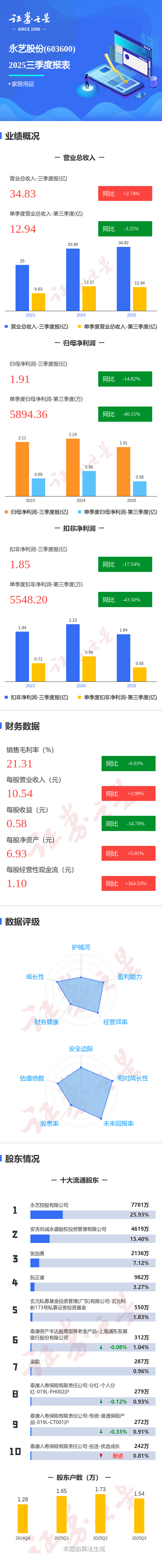证券之星消息,永艺股份2025年三季报显示,公司主营收入34.83亿元,同比上升2.75%;归母净利润1.91亿元,同比下降14.83%;扣非净利润1.85亿元,同比下降17.54%;其中2025年第三季度,公司单季度主营收入12.94亿元,同比下降3.26%;单季度归母净利润5894.36万元,同比下降40.15%;单季度扣非净利润5548.2万元,同比下降43.51%;负债率49.75%,投资收益-165.19万元,财务费用-437.53万元,毛利率21.31%。