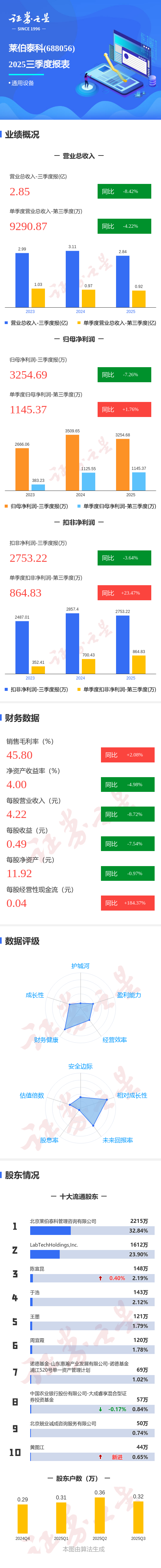 证券之星消息,莱伯泰科2025年三季报显示,公司主营收入2.85亿元,同比下降8.43%;归母净利润3254.69万元,同比下降7.26%;扣非净利润2753.22万元,同比下降3.65%;其中2025年第三季度,公司单季度主营收入9290.87万元,同比下降4.22%;单季度归母净利润1145.37万元,同比上升1.76%;单季度扣非净利润864.83万元,同比上升23.47%;负债率11.55%,投资收益385.78万元,财务费用-261.79万元,毛利率45.8%。