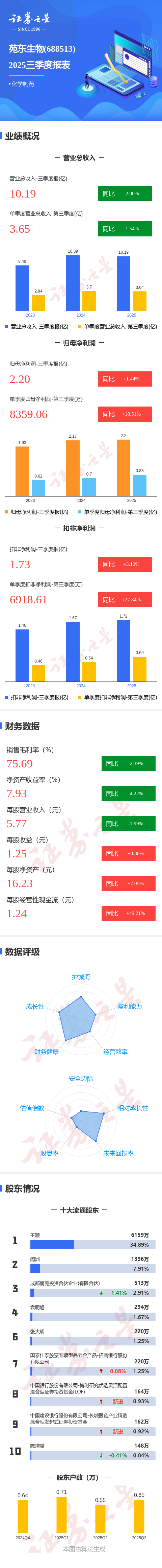 证券之星消息,苑东生物2025年三季报显示,公司主营收入10.19亿元,同比下降2.0%;归母净利润2.2亿元,同比上升1.45%;扣非净利润1.73亿元,同比上升3.1%;其中2025年第三季度,公司单季度主营收入3.65亿元,同比下降1.55%;单季度归母净利润8359.06万元,同比上升18.52%;单季度扣非净利润6918.61万元,同比上升27.85%;负债率19.47%,投资收益249.7万元,财务费用-474.82万元,毛利率75.69%。