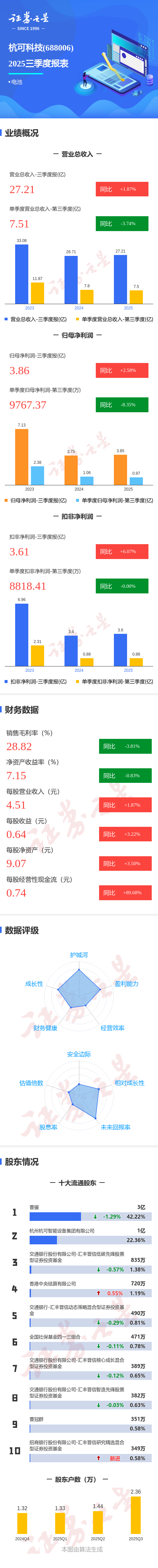 证券之星消息,杭可科技2025年三季报显示,公司主营收入27.21亿元,同比上升1.87%;归母净利润3.86亿元,同比上升2.59%;扣非净利润3.61亿元,同比上升6.08%;其中2025年第三季度,公司单季度主营收入7.51亿元,同比下降3.75%;单季度归母净利润9767.37万元,同比下降8.35%;单季度扣非净利润8818.41万元,同比下降0.01%;负债率44.38%,投资收益213.11万元,财务费用-1.18亿元,毛利率28.82%。