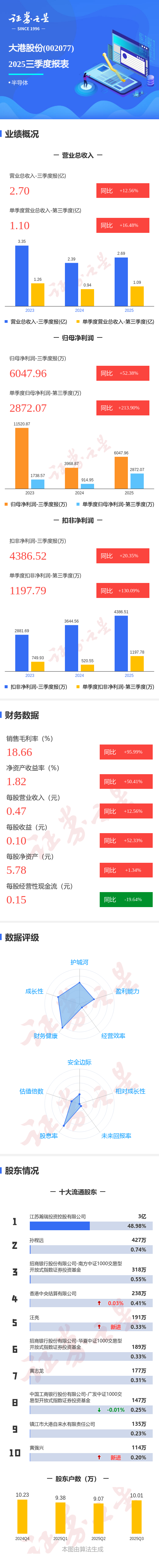 证券之星消息,大港股份2025年三季报显示,公司主营收入2.7亿元,同比上升12.57%;归母净利润6047.96万元,同比上升52.38%;扣非净利润4386.52万元,同比上升20.36%;其中2025年第三季度,公司单季度主营收入1.1亿元,同比上升16.48%;单季度归母净利润2872.07万元,同比上升213.9%;单季度扣非净利润1197.79万元,同比上升130.1%;负债率17.8%,投资收益6665.53万元,财务费用1629.67万元,毛利率18.66%。