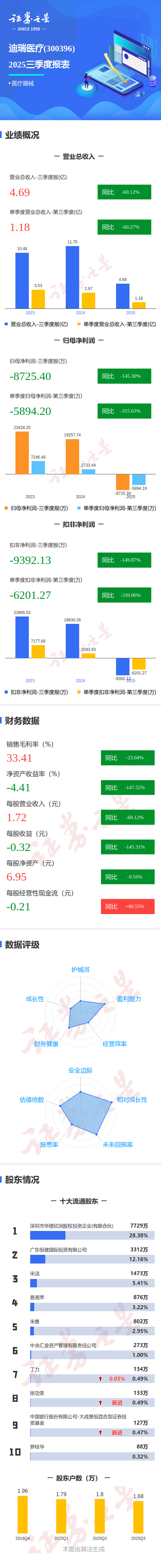 证券之星消息,迪瑞医疗2025年三季报显示,公司主营收入4.69亿元,同比下降60.12%;归母净利润-8725.4万元,同比下降145.31%;扣非净利润-9392.13万元,同比下降149.88%;其中2025年第三季度,公司单季度主营收入1.18亿元,同比下降60.27%;单季度归母净利润-5894.2万元,同比下降315.63%;单季度扣非净利润-6201.27万元,同比下降339.07%;负债率31.92%,投资收益1862.01万元,财务费用-2456.91万元,毛利率33.41%。