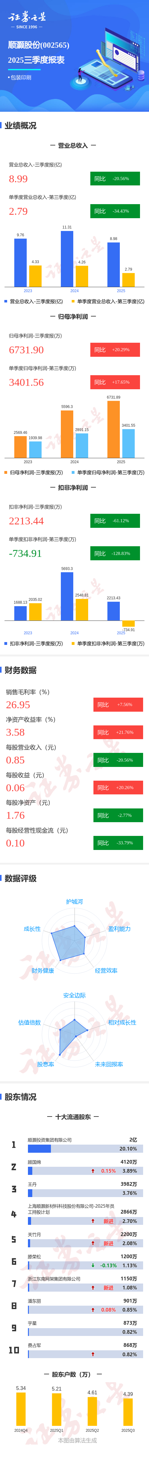 证券之星消息,顺灏股份2025年三季报显示,公司主营收入8.99亿元,同比下降20.57%;归母净利润6731.9万元,同比上升20.29%;扣非净利润2213.44万元,同比下降61.12%;其中2025年第三季度,公司单季度主营收入2.79亿元,同比下降34.43%;单季度归母净利润3401.56万元,同比上升17.65%;单季度扣非净利润-734.91万元,同比下降128.83%;负债率22.33%,投资收益2479.19万元,财务费用-187.22万元,毛利率26.95%。