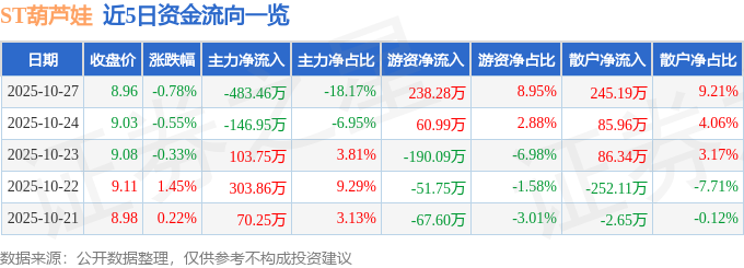 证券之星消息,截至2025年10月27日收盘,ST葫芦娃(605199)报收于8.96元,下跌0.78%,换手率0.74%,成交量2.97万手,成交额2661.08万元。