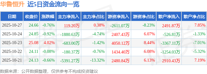 证券之星消息,截至2025年10月27日收盘,华鲁恒升(600426)报收于24.66元,下跌0.76%,换手率0.6%,成交量12.74万手,成交额3.17亿元。