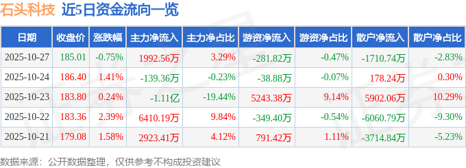 证券之星消息,截至2025年10月27日收盘,石头科技(688169)报收于185.01元,下跌0.75%,换手率1.25%,成交量3.25万手,成交额6.05亿元。