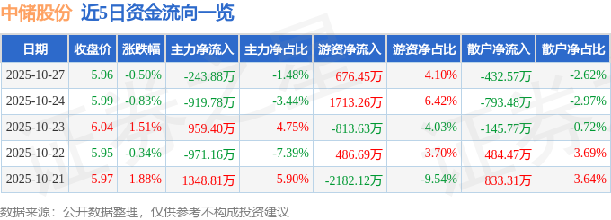 证券之星消息,截至2025年10月27日收盘,中储股份(600787)报收于5.96元,下跌0.5%,换手率1.27%,成交量27.65万手,成交额1.65亿元。