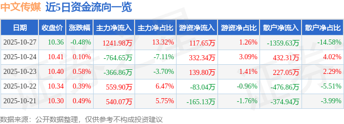 10月27日的资金流向数据方面,主力资金净流入1241.98万元,占总成交额13.32%,游资资金净流入117.65万元,占总成交额1.26%,散户资金净流出1359.63万元,占总成交额14.58%。