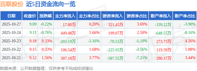 证券之星消息,截至2025年10月27日收盘,百联股份(600827)报收于9.09元,下跌0.22%,换手率0.6%,成交量9.56万手,成交额8699.62万元。
