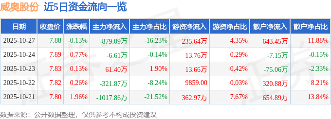 证券之星消息,截至2025年10月27日收盘,威奥股份(605001)报收于7.88元,下跌0.13%,换手率1.75%,成交量6.89万手,成交额5417.66万元。
