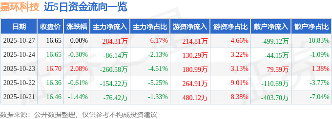 10月27日的资金流向数据方面,主力资金净流入284.31万元,占总成交额6.17%,游资资金净流入214.81万元,占总成交额4.66%,散户资金净流出499.12万元,占总成交额10.83%。