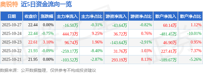 10月27日的资金流向数据方面,主力资金净流出16.5万元,占总成交额0.31%,游资资金净流出43.64万元,占总成交额0.82%,散户资金净流入60.14万元,占总成交额1.12%。