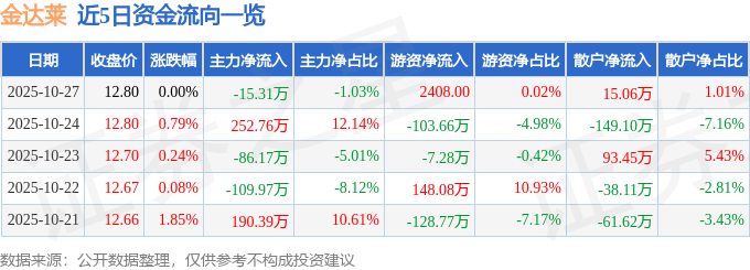 10月27日的资金流向数据方面,主力资金净流出15.31万元,占总成交额1.03%,游资资金净流入0.24万元,占总成交额0.02%,散户资金净流入15.06万元,占总成交额1.01%。