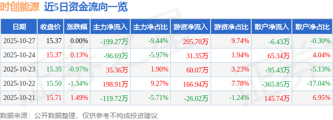证券之星消息,截至2025年10月27日收盘,时创能源(688429)报收于15.37元,上涨0.0%,换手率1.15%,成交量1.37万手,成交额2111.23万元。