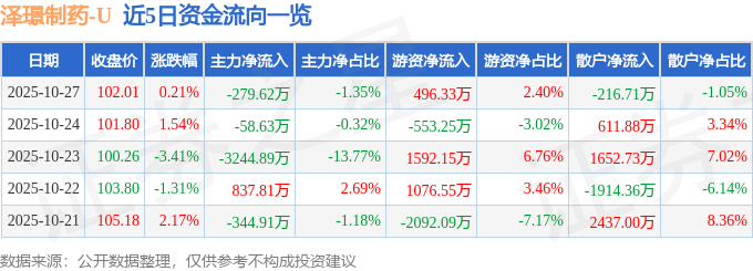 证券之星消息,截至2025年10月27日收盘,泽璟制药(688266)报收于102.01元,上涨0.21%,换手率0.76%,成交量2.0万手,成交额2.07亿元。