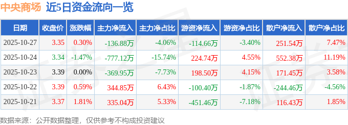 10月27日的资金流向数据方面,主力资金净流出136.88万元,占总成交额4.06%,游资资金净流出114.66万元,占总成交额3.4%,散户资金净流入251.54万元,占总成交额7.47%。