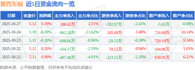 证券之星消息,截至2025年10月27日收盘,晋西车轴(600495)报收于5.12元,上涨0.39%,换手率1.22%,成交量14.73万手,成交额7516.38万元。