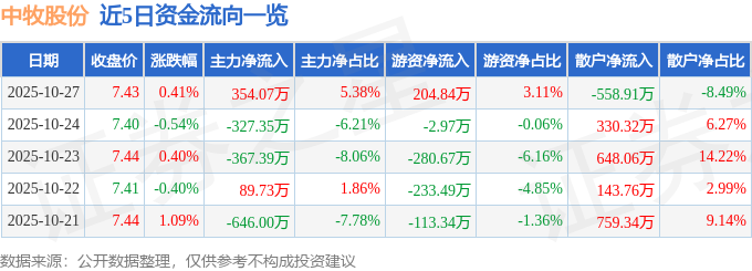 证券之星消息,截至2025年10月27日收盘,中牧股份(600195)报收于7.43元,上涨0.41%,换手率0.87%,成交量8.88万手,成交额6585.36万元。