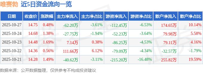 证券之星消息,截至2025年10月27日收盘,唯赛勃(688718)报收于14.75元,上涨0.48%,换手率0.67%,成交量1.17万手,成交额1723.03万元。