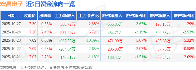 证券之星消息,截至2025年10月27日收盘,宏昌电子(603002)报收于7.3元,上涨0.55%,换手率1.82%,成交量20.63万手,成交额1.51亿元。