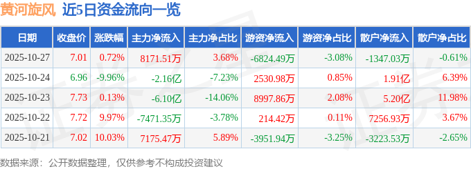 10月27日的资金流向数据方面,主力资金净流入8171.51万元,占总成交额3.68%,游资资金净流出6824.49万元,占总成交额3.08%,散户资金净流出1347.03万元,占总成交额0.61%。